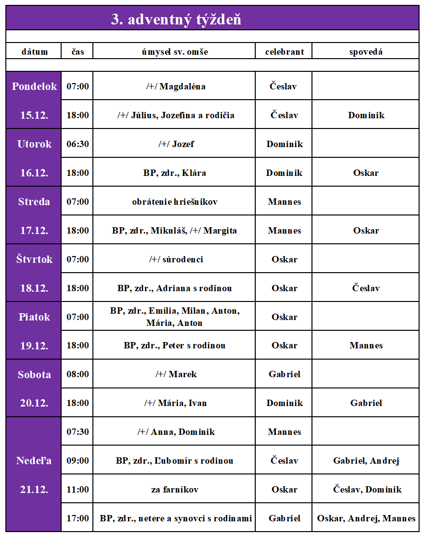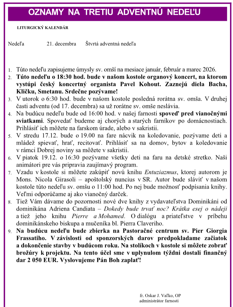 Bude sa konať v nedeľu 14.12. o 18:30 v našom kostole.